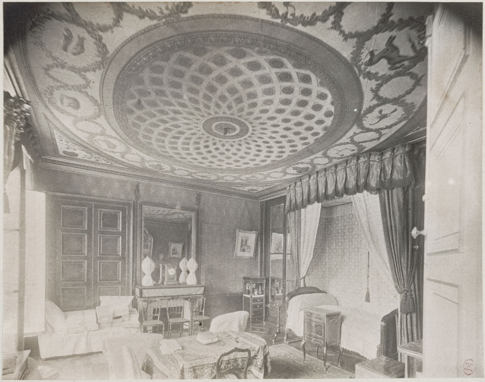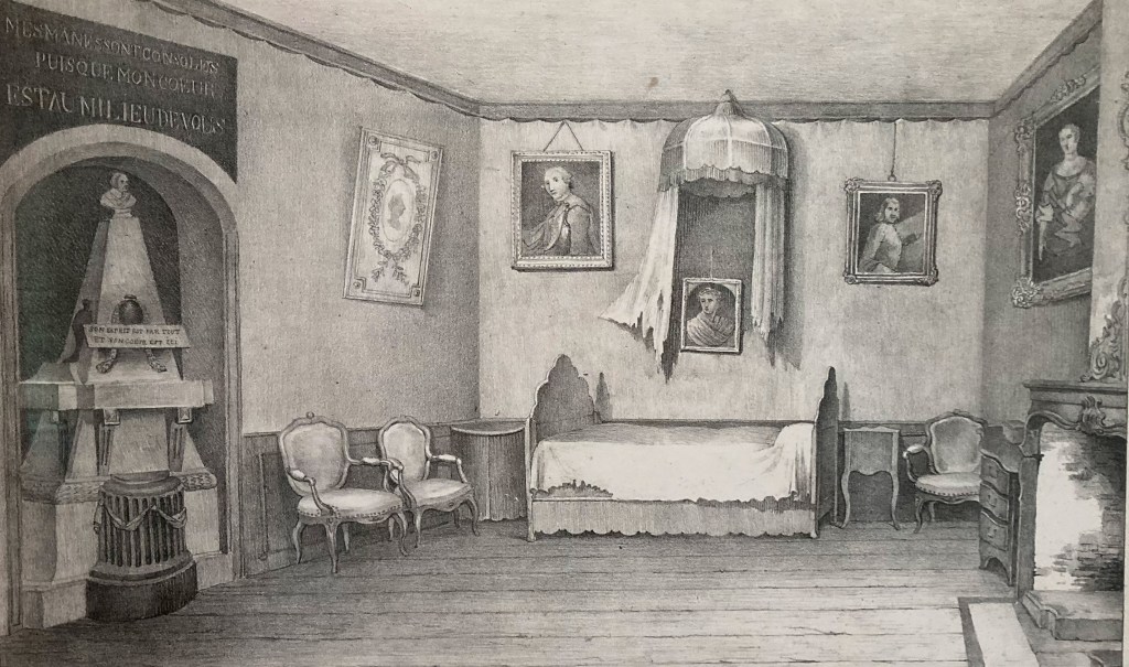 La chambre de Voltaire à Ferney à la fin du XVIIIe siècle, avec le mausolée de son cœur